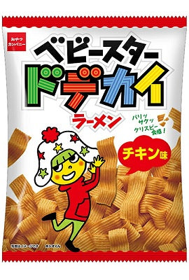 ”Baby Star Dodekai Ramen Chicken” is a large-sized fried noodle snack with a crunchy texture. The chicken flavour is strong and satisfying, making it a perfect snack or light meal.