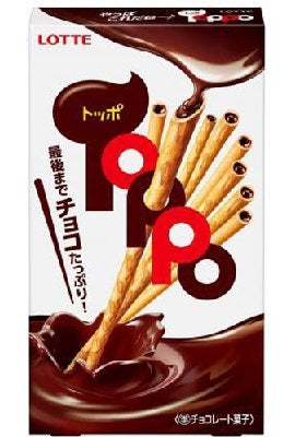Toppo is a crispy pretzel filled with chocolate. The crispy, savoury outside balances the sweet chocolate inside. The handles are not easily soiled by the chocolate, making it an easy snack to enjoy.